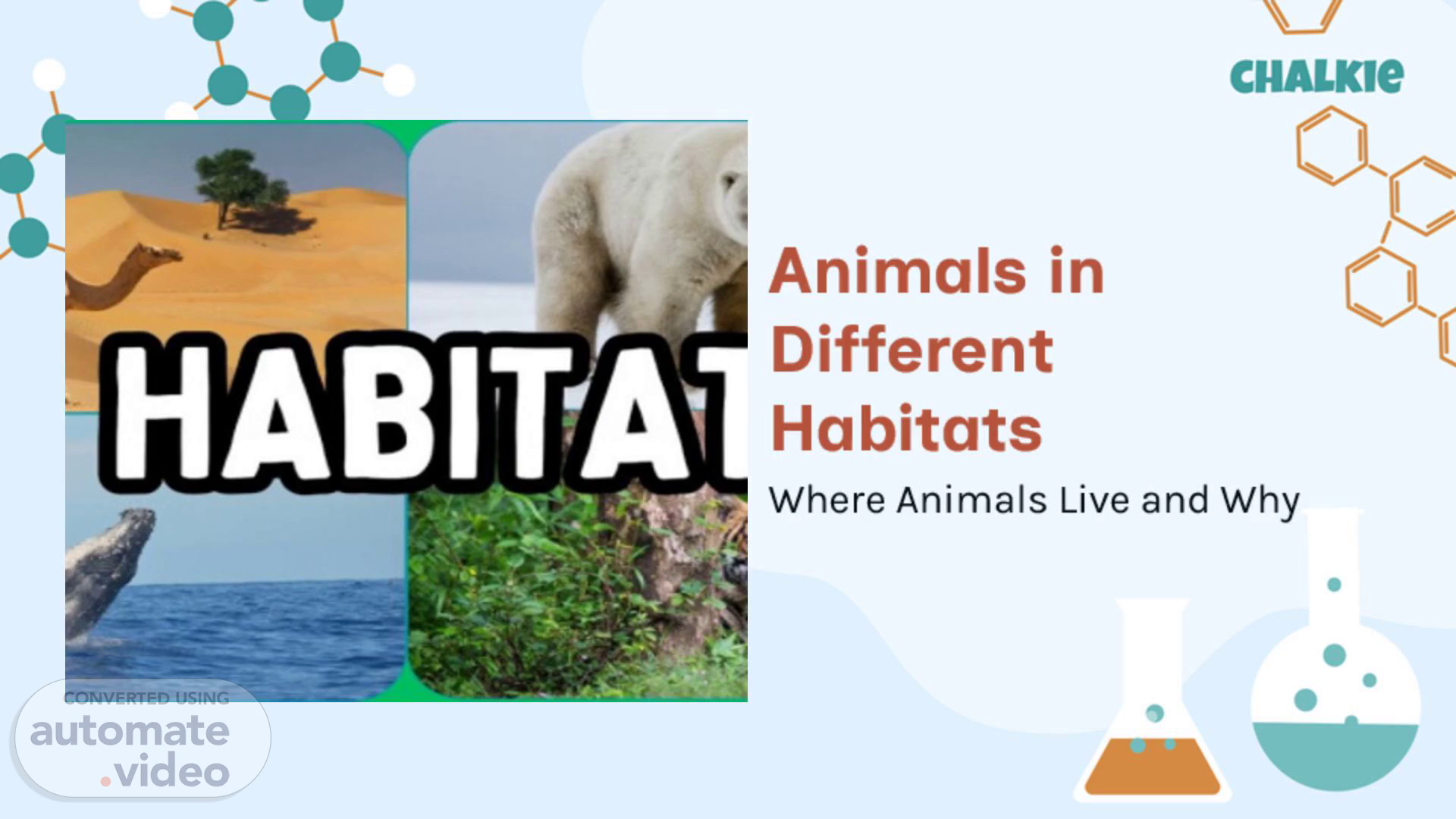 [Audio] We are excited to share with you the amazing world of animals and the different habitats they call home. Our meeting today focuses on the theme "Animals in Different Habitats." This presentation explores the various habitats that animals live in and the reasons behind their choice of habitat. It is divided into four main sections, each focusing on a different type of habitat. These sections cover forests, water, snow, and deserts, and the animals that live in each of these habitats. Our goal is to educate and engage our audience, while promoting an appreciation for the natural world. Our presentation begins with the title slide, which sets the scene for our journey into the world of animals and habitats. The title slide reads: "Animals in Different Habitats Where Animals Live and Why." This is the introductory slide, which introduces the topic of Animals in Different Habitats Where Animals Live and Why. The first section of our presentation covers the forest habitat. In this section, we will explore the types of trees, plants, and other organisms that live in the forest ecosystem. We will also examine the role of animals such as bears, deer, and squirrels in the forest ecosystem. Next, we will move on to the water habitat. In this section, we will explore the different types of aquatic life, including fish, dolphins, and whales. We will also examine the role of animals such as otters, beavers, and birds in the water habitat. After that, we will cover the snow habitat. In this section, we will explore the unique adaptations of animals such as penguins, arctic foxes, and polar bears in the snow environment. We will also examine the role of animals such as seals, walruses, and snowy owls in the snow habitat. Finally, we will conclude with the desert habitat. In this section, we will explore the unique adaptations of animals such as camels, lizards, and snakes in the desert environment. We will also examine the role of animals such as coyotes, jackrabbits, and roadrunners in the desert habitat. Throughout our presentation, we will use visual aids and examples to illustrate the different habitats and the animals that live in them. Our goal is to educate and engage our audience, while promoting an appreciation for the natural world..