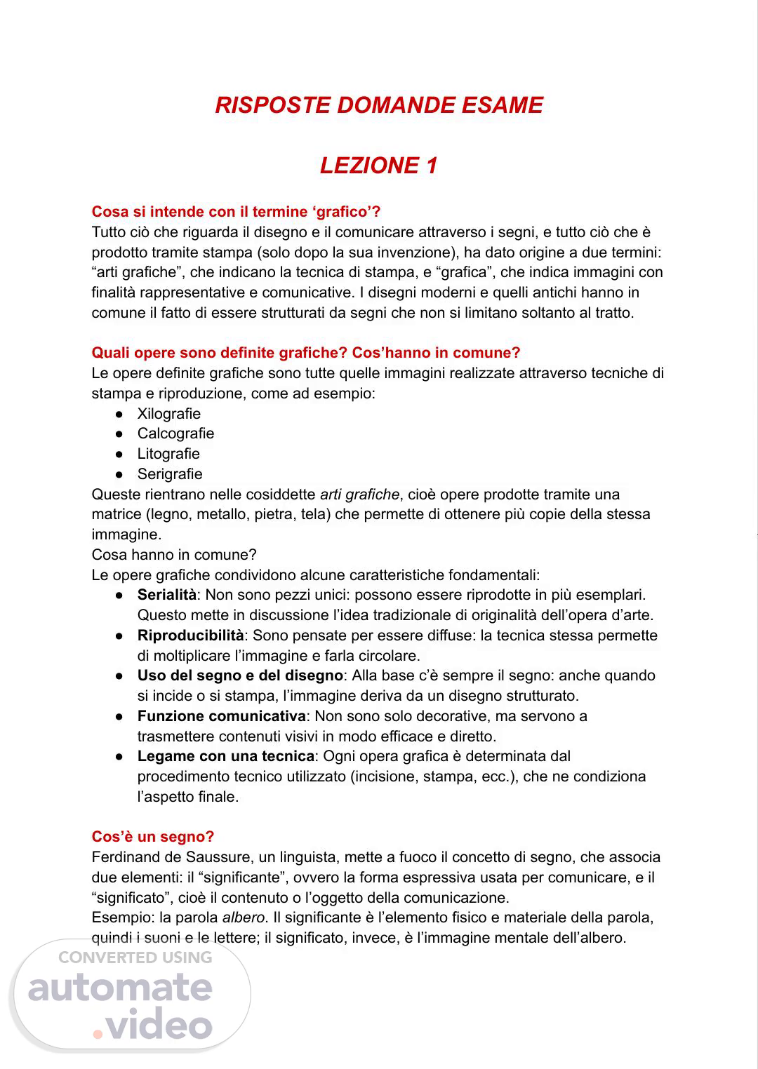 [Audio] RISPOSTE DOMANDE ESAME LEZIONE 1 Cosa si intende con il termine 'grafico'? Tutto ciò che riguarda il disegno e il comunicare attraverso i segni, e tutto ciò che è prodotto tramite stampa (solo dopo la sua invenzione), ha dato origine a due termini: "arti grafiche", che indicano la tecnica di stampa, e "grafica", che indica immagini con finalità rappresentative e comunicative. I disegni moderni e quelli antichi hanno in comune il fatto di essere strutturati da segni che non si limitano soltanto al tratto. Quali opere sono definite grafiche? Cos'hanno in comune? Le opere definite grafiche sono tutte quelle immagini realizzate attraverso tecniche di stampa e riproduzione, come ad esempio: Xilografie Calcografie Litografie Serigrafie Queste rientrano nelle cosiddette arti grafiche, cioè opere prodotte tramite una matrice (legno, metallo, pietra, tela) che permette di ottenere più copie della stessa immagine. Cosa hanno in comune? Le opere grafiche condividono alcune caratteristiche fondamentali: Serialità: Non sono pezzi unici: possono essere riprodotte in più esemplari. Questo mette in discussione l'idea tradizionale di originalità dell'opera d'arte. Riproducibilità: Sono pensate per essere diffuse: la tecnica stessa permette di moltiplicare l'immagine e farla circolare. Uso del segno e del disegno: Alla base c'è sempre il segno: anche quando si incide o si stampa, l'immagine deriva da un disegno strutturato. Funzione comunicativa: Non sono solo decorative, ma servono a trasmettere contenuti visivi in modo efficace e diretto. Legame con una tecnica: Ogni opera grafica è determinata dal procedimento tecnico utilizzato (incisione, stampa, ecc.), che ne condiziona l'aspetto finale. Cos'è un segno? Ferdinand de Saussure, un linguista, mette a fuoco il concetto di segno, che associa due elementi: il "significante", ovvero la forma espressiva usata per comunicare, e il "significato", cioè il contenuto o l'oggetto della comunicazione. Esempio: la parola albero. Il significante è l'elemento fisico e materiale della parola, quindi i suoni e le lettere; il significato, invece, è l'immagine mentale dell'albero..
