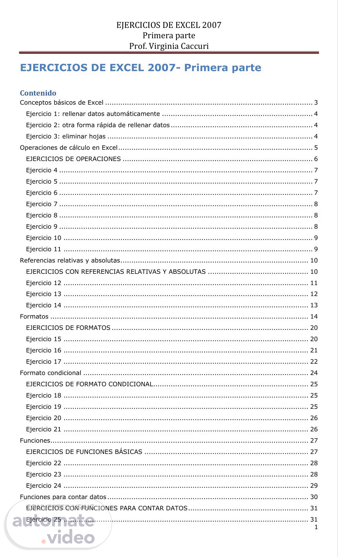 [Audio] Ejercicios De Excel 2007 Primera parte Prof. Virginia Caccuri Ejercicio 26 ................................................................................................................ 32 Ejercicio 27 ................................................................................................................ 32 2.
