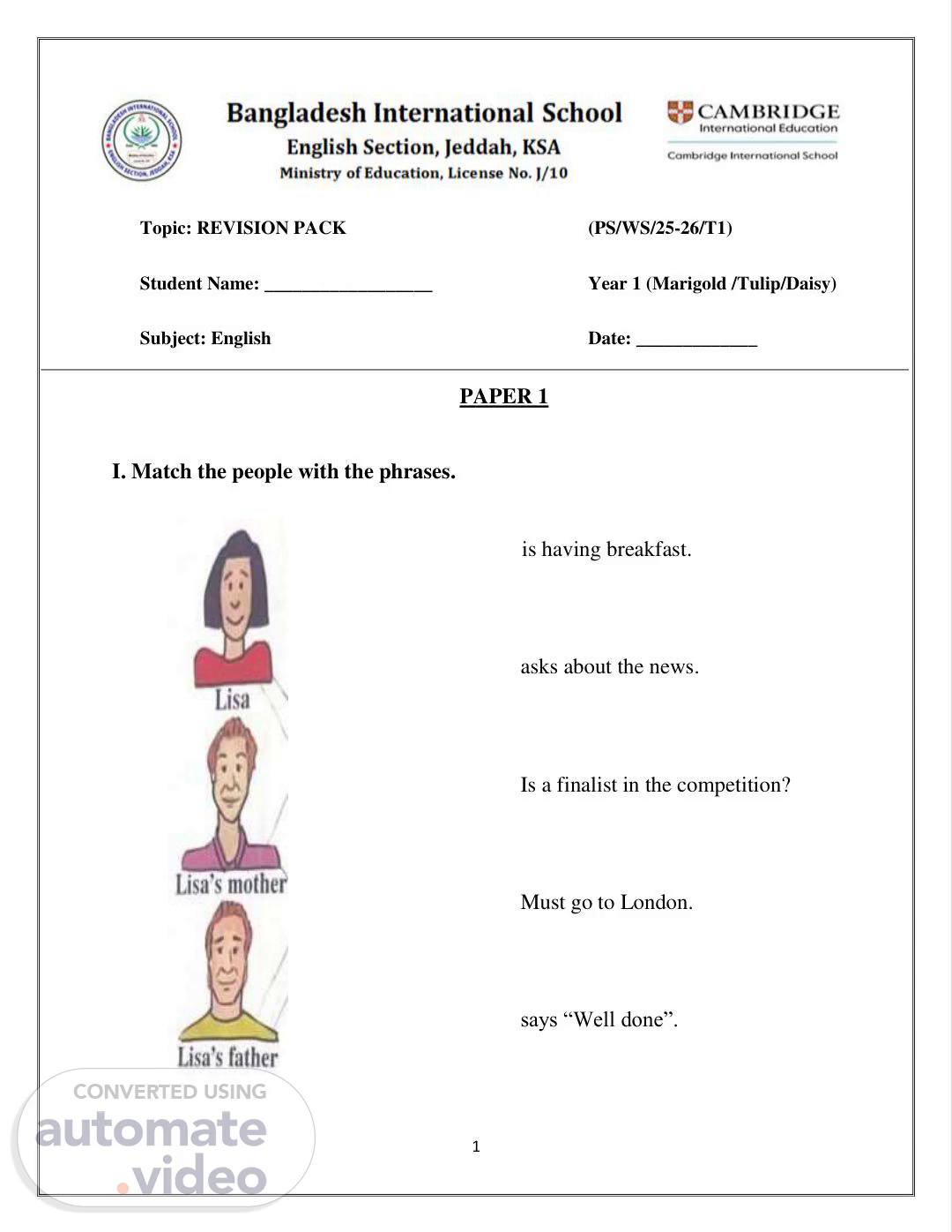1 Topic: REVISION PACK (PS/WS/25-26/T1) Student Name: __________________ Year 1 (Marigold /Tulip/Daisy) Subject: English Date: _____________ PAPER 1 I. Match the people with the phrases. is having breakfast. asks about the news. Is a finalist in the competition? Must go to London. says “Well done”..