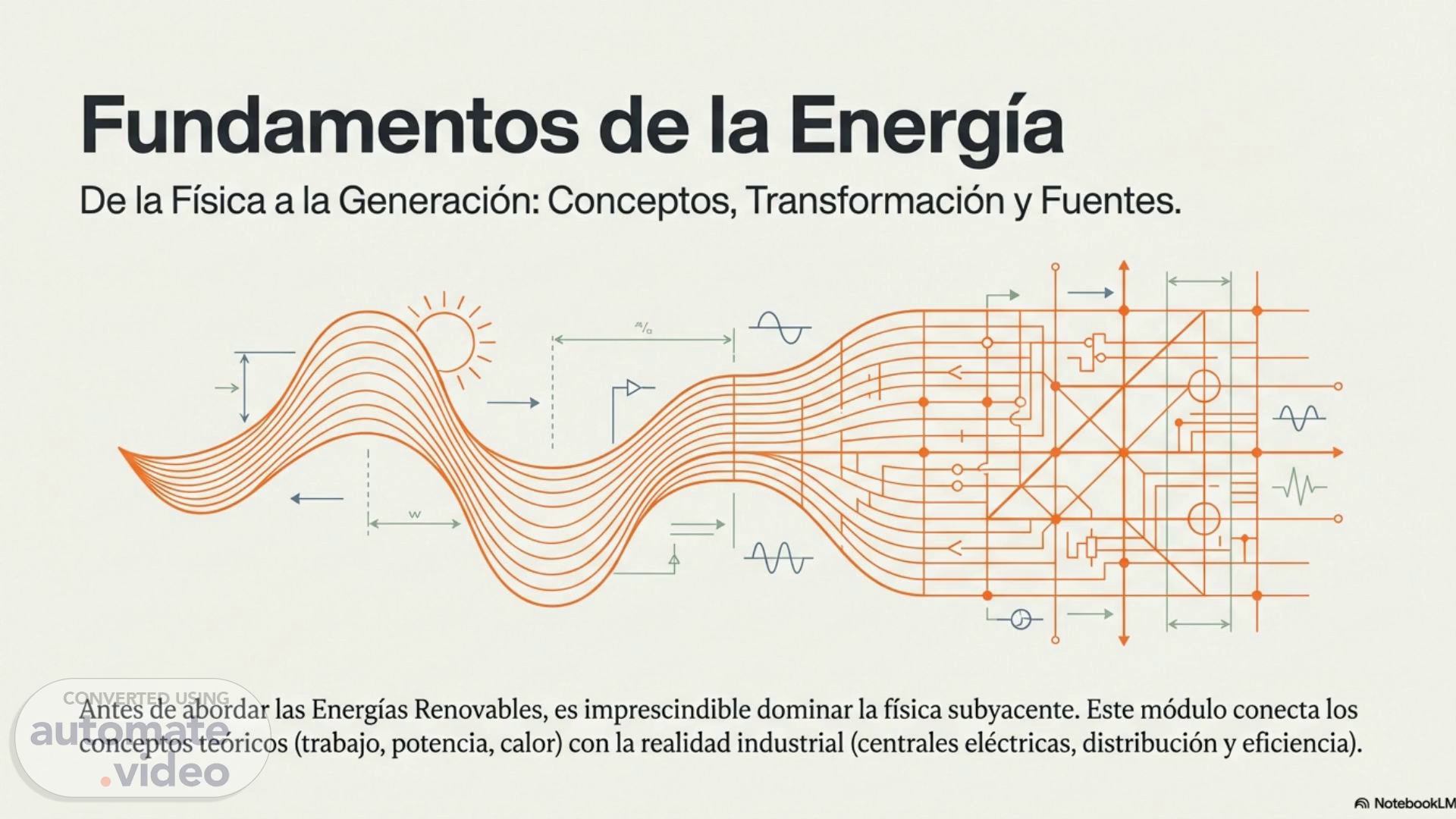Fundamentos de Ia Energia De la Fisica a la Generaciön: Conceptos, Transformaciön y Fuentes. Antes de abordar las Energias Renovables, es imprescindible dominar la ffsica subyacente. Este m6dulo conecta los conceptos te6ricos (trabajo, potencia, calor) con la realidad industrial (centrales eléctricas, distribuci6n y eficiencia). NotebookLM.