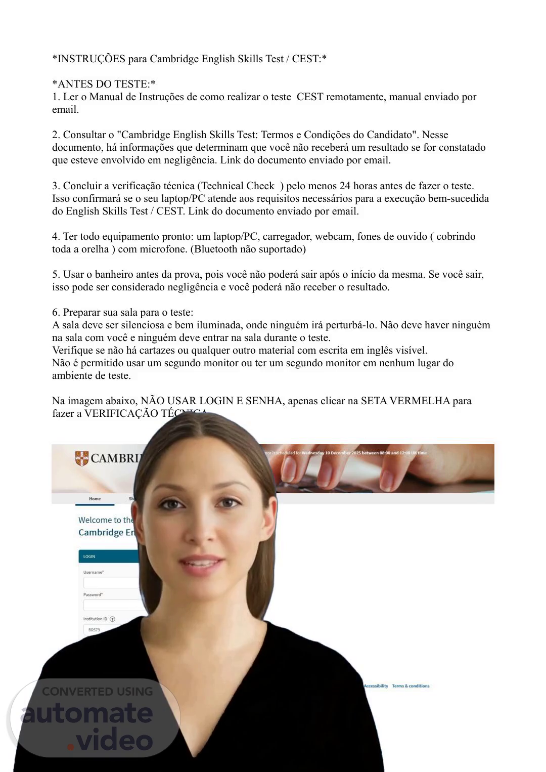 *INSTRUÇÕES FINAIS para Cambridge English Skills Test / CEST:* AO INICIAR os procedimentos para o CEST: 1.Sugerimos desligar o computador e ligá-lo novamente para iniciar o teste. 2.Fechar todos os programas (exceto o navegador), todos aplicativos e todas as abas do navegador no seu PC ou laptop. Desinstale qualquer software de inteligência artificial (IA). 3. Usar navegador - Windows - versão mais recente do Google Chrome ou Microsoft Edge / macOS - somente a versão mais recente do Google Chrome 4. Fazer : PHOTO ID VERIFICATION - olhar para câmera e mostrar seu documento pessoal com foto. 5. Gravar o seu ambiente: ENVIRONMENT TEST. Iniciar a gravação do seu local com a gravação da MESA, siga com a gravação 360° no ambiente, depois abaixe e faça a gravação do chão e depois a gravação do teto e finalizando com o papel das anotações na MESA. DURANTE O TESTE: Você será monitorado por fiscal do centro com o apoio de inteligência artificial (IA) automatizado da Talview. O teste será gravado. Você precisa permanecer dentro do enquadramento da câmera durante o teste. O serviço de vigilância por IA monitorará qualquer comportamento suspeito, uso de dispositivos adicionais ou itens não autorizados. Have a good test!.