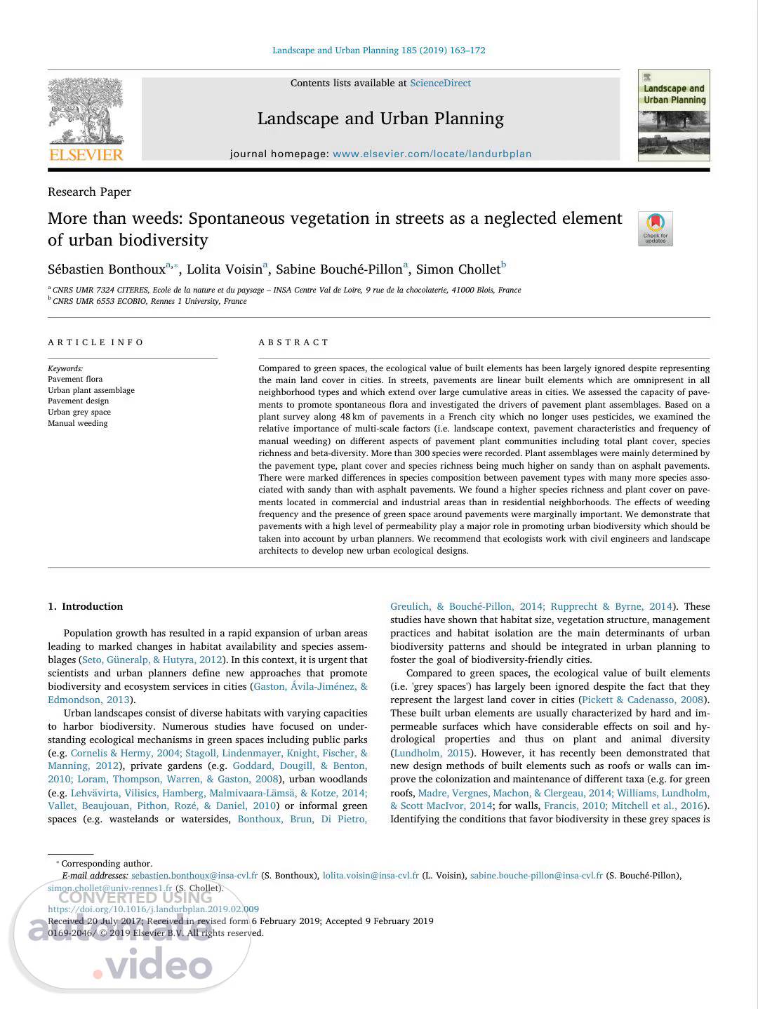 [Audio] S. Bonthoux, et al. Landscape and Urban Planning 185 (2019) 163–172 Bjornstad, O.N. (2016). Package 'ncf'. Bonthoux, S., Brun, M., Di Pietro, F., Greulich, S., & Bouché-Pillon, S. (2014). How can wastelands promote biodiversity in cities? A review. Landscape and Urban Planning, 132, 79–88. Bonthoux, S., Chollet, S., Balat, I., Legay, N., & Voisin, L. (2019). Improving nature experience in cities: What are people's preferences for vegetated streets? Journal of Environmental Management, 230, 335–344. Borcard, D., Legendre, P., & Drapeau, P. (1992). Partialling out the spatial component of ecological variation. Ecology, 73, 1045–1055. Burnham, K. P., & Anderson, D. R. (2003). Model selection and multimodel inference: A practical information-theoretic approach. Springer Science & Business Media. Cade, B. S. (2015). Model averaging and muddled multimodel inferences. Ecology, 96, 2370–2382. Cadotte, M. W., Yasui, S. L. E., Livingstone, S., & MacIvor, J. S. (2017). Are urban systems beneficial, detrimental, or indifferent for biological invasion? Biological Invasions, 19, 3489–3503. Carboneras, C., Genovesi, P., Vilà, M., Blackburn, T. M., Carrete, M., Clavero, M., ... Wynde, R. (2018). A prioritised list of invasive alien species to assist the effective implementation of EU legislation. Journal of Applied Ecology, 55, 539–547. Chevan, A., & Sutherland, M. (1991). Hierarchical partitioning. The American Statistician, 45, 90–96. Cordier, J., Dupré, R., & Vahrameev, P. (2010). Catalogue de la flore sauvage de la région Centre. Symbioses, 26, 36–84. Weeding of public spaces can represent a large part of the annual municipal budget. In many countries the use of herbicides is being greatly reduced and implies developing new approaches for urban plant management. Furthermore, a recent social study shows that people can accept the moderate presence of spontaneous vegetation on pavements (French respondents, Bonthoux et al., 2019). That is why the previous objective of having no plant growth on pavements achieved by using herbicides must be reconsidered. In line with our results indicating that pavements could host significant plant diversity combined with the limited potential for manual weeding to control plant development, indicate that differentiated management strategies could be set up. These strategies are developed in green spaces and propose a globally biodiversity-friendly management with management frequency varying between spaces according to the urban dwellers' uses (Shwartz et al., 2013). For pavements, urban managers could for example concentrate efforts on reducing plant growth in areas of specific importance such as historical centers, but promote installation of plants by developing extensive management (i.e. mowing/weeding two or three times per year) in commercial and industrial areas. 5. Conclusion: using pavement webs to spread vegetation through the urban matrix Cornelis, J., & Hermy, M. (2004). Biodiversity relationships in urban and suburban parks in Flanders. Landscape and Urban Planning, 69, 385–401. De Caceres, M., & Jansen, F. (2016). Package 'indicspecies'. De Cauwer, B., Fagot, M., Beeldens, A., Boonen, E., Bulcke, R., & Reheul, D. (2014b). Effectiveness of water permeable joint filling materials for weed prevention in paved areas. Weed Research, 54, 532–540. De Cauwer, B., Fagot, M., Beeldens, A., Boonen, E., Bulcke, R., & Reheul, D. (2014a). Reduced weed growth with different paving constructions. Weed Research, 54, 151–161. Dormann, C. F., Elith, J., Bacher, S., Buchmann, C., Carl, G., Carré, G., ... Leitão, P. J. (2013). Collinearity: A review of methods to deal with it and a simulation study evaluating their performance. Ecography, 36, 27–46. Dufrene, M., & Legendre, P. (1997). Species assemblages and indicator.