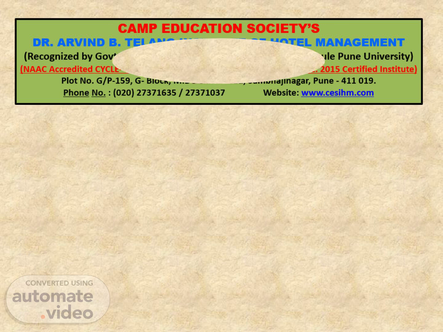 CAMP EDUCATION SOCIETY’S DR. ARVIND B. TELANG INSTITUTE OF HOTEL MANAGEMENT (Recognized by Govt. of Maharashtra & Affiliated to Savitribai Phule Pune University) (NAAC Accredited CYCLE- II with ‘B+’ Grade CGPA 2.64 (2024) & ISO 9001: 2015 Certified Institute) Plot No. G/P-159, G- Block, MIDC Chinchwad, Sambhajinagar, Pune - 411 019. Phone No. : (020) 27371635 / 27371037 Website: www.cesihm.com.