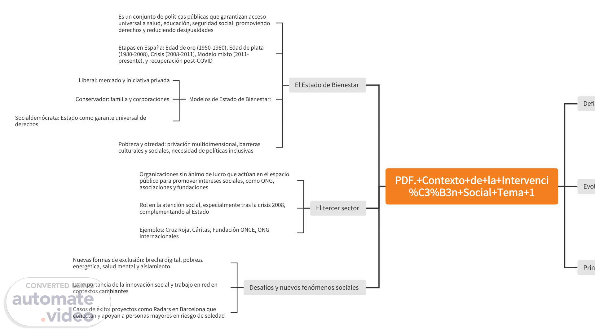 PDF.+Contexto+de+la+Intervenci %C3%B3n+Social+Tema+1 Definición�de�intervención�social Evolución�histórica�de�la�intervención�social Principios�de�la�intervención�social El�Estado�de�Bienestar El�tercer�sector Desafíos�y�nuevos�fenómenos�sociales Es�una�actividad�formal�y�organizada�que�busca�responder�a necesidades�sociales�y�mejorar�la�interacción�entre�las personas,�aspirando�a�una�legitimación�pública�y�social Se�caracteriza�por�ser�intencional,�diagnóstica, interdisciplinaria,�participativa�y�ética Nuevas�formas�de�exclusión:�brecha�digital,�pobreza energética,�salud�mental�y�aislamiento La�importancia�de�la�innovación�social�y�trabajo�en�red�en contextos�cambiantes Casos�de�éxito:�proyectos�como�Radars�en�Barcelona�que conectan�y�apoyan�a�personas�mayores�en�riesgo�de�soledad Profesionalidad,�acción�socioeducativa�y�justicia�social Confidencialidad,�formación�continua,�solidaridad,�respeto, coherencia�institucional,�participación�comunitaria�y coordinación Organizaciones�sin�ánimo�de�lucro�que�actúan�en�el�espacio público�para�promover�intereses�sociales,�como�ONG, asociaciones�y�fundaciones Rol�en�la�atención�social,�especialmente�tras�la�crisis�2008, complementando�al�Estado Ejemplos:�Cruz�Roja,�Cáritas,�Fundación�ONCE,�ONG internacionales Es�un�conjunto�de�políticas�públicas�que�garantizan�acceso universal�a�salud,�educación,�seguridad�social,�promoviendo derechos�y�reduciendo�desigualdades Etapas�en�España:�Edad�de�oro�(1950-1980),�Edad�de�plata (1980-2008),�Crisis�(2008-2011),�Modelo�mixto�(2011- presente),�y�recuperación�post-COVID Modelos�de�Estado�de�Bienestar: Pobreza�y�otredad:�privación�multidimensional,�barreras culturales�y�sociales,�necesidad�de�políticas�inclusivas Liberal:�mercado�y�iniciativa�privada Conservador:�familia�y�corporaciones Socialdemócrata:�Estado�como�garante�universal�de derechos Edad�Media:�modelo�de�caridad�cristiana,�apoyo�mediante limosnas,�albergues�y�hospitales�religiosos Edad�Moderna:�beneficencia�pública�como�derecho ciudadano,�formalizada�en�1849�en�España Finales�del�siglo�XIX:�reconocimiento�de�derechos�de�los marginados,�inicio�de�políticas�públicas�y�Sistemas�de Seguridad�Social Siglo�XX�y�actualidad:�Participación�del�Estado,�tercer�sector y�redes�comunitarias,�con�crisis�y�recuperación�post-COVID.