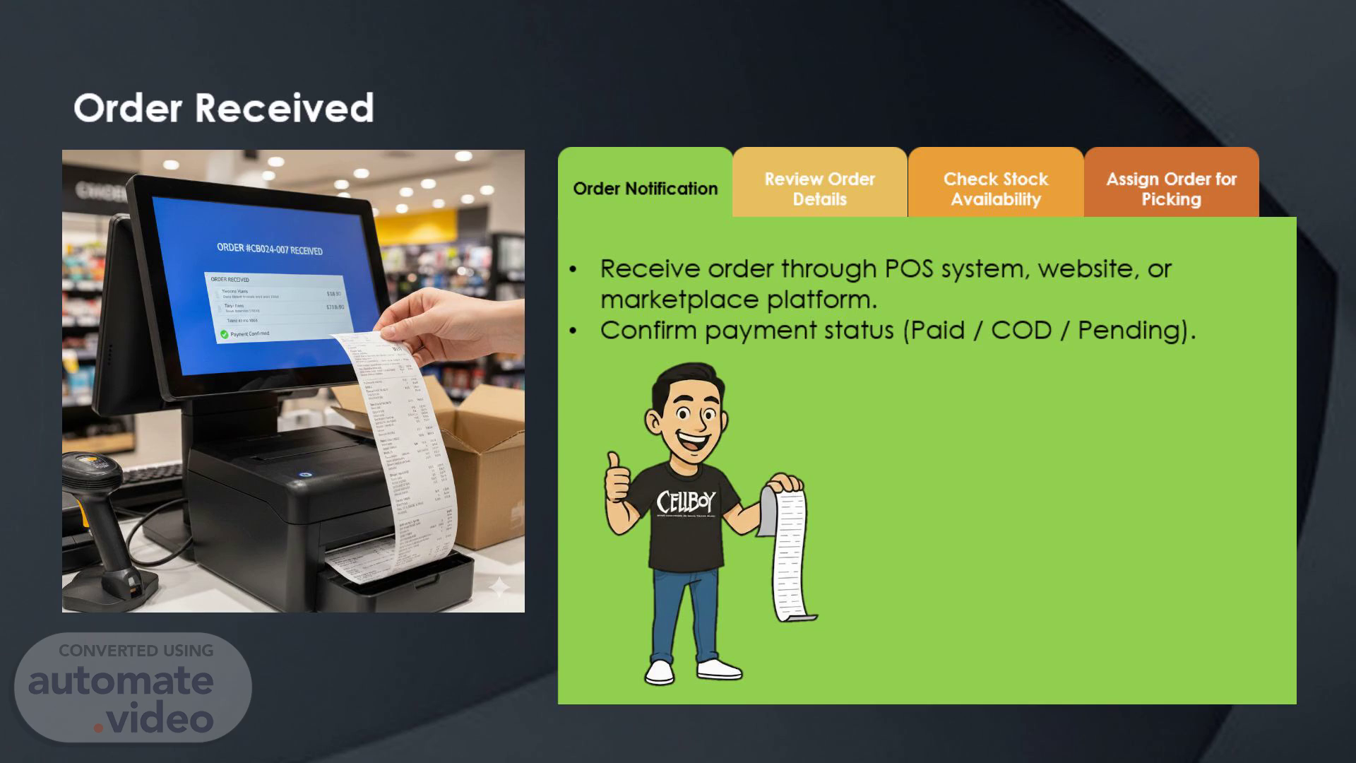 [Audio] Order Received Order Notification Receive order through POS system, website, or marketplace platform. Confirm payment status (Paid / COD / Pending)..