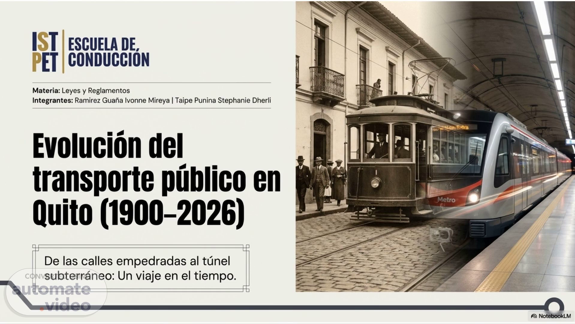 1ST ESCUELA DE, ET CONDUCCION Materia: Leyes y Reglamentos Integrantes: Ramirez Guaha Ivonne Mireya I Taipe Punina Stephanie Dherli Evoluciön del transporte püblico en Quito (1900-2026) De las calles empedradas al tünel subterråneo: Un viaje en el tiempo. Metro.