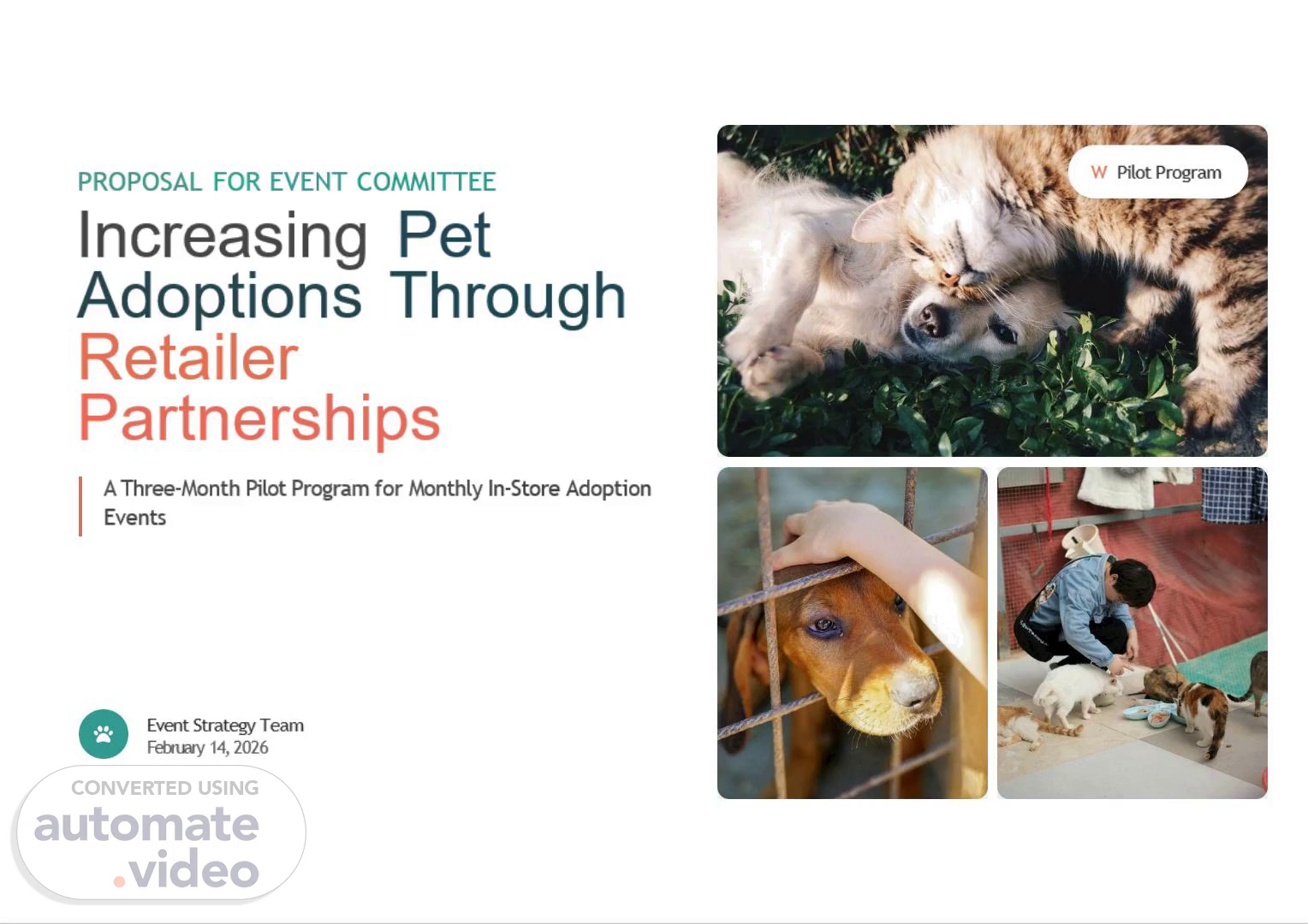 [Audio] Today, we're presenting a proposal to increase pet adoptions through strategic retailer partnerships. This is a structured three-month pilot program focused on hosting monthly in-store adoption events. Our goal is to validate whether indoor retailer partnerships can significantly improve adoption outcomes. We'll walk through the challenge, the solution, early results, and our proposed next steps..