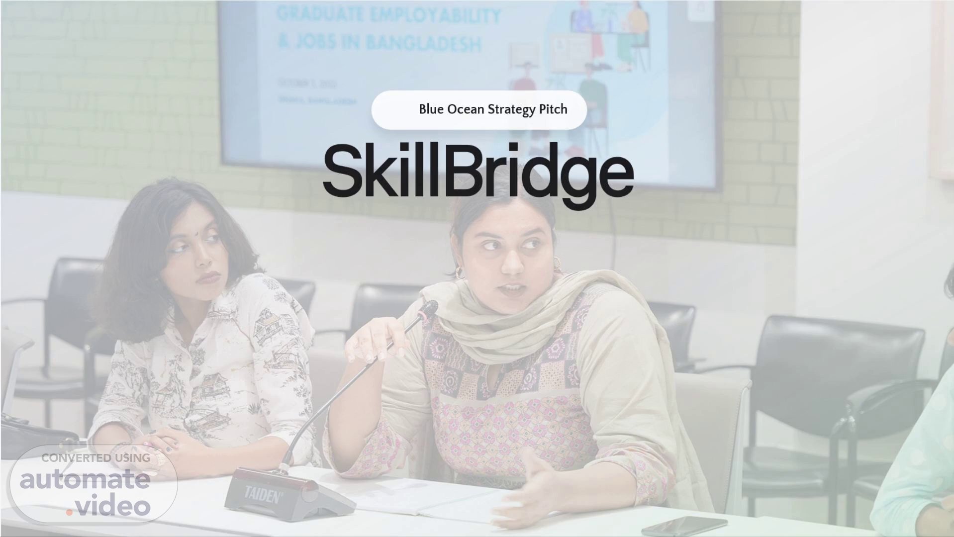 [Audio] Conclusion Why SkillBridge Will Succeed True Blue Ocean Scalable Model Eliminate cost barrier entirely. Create massive value with guaranteed opportunities. Built for Bangladesh but scalable across all of South Asia. Massive potential. New Market Creation Untapped Markets Not competing in red ocean. Creating entirely new market for skills-based employment. Tap markets nobody else is reaching. 5 million people waiting for opportunity. Dual Solution We're creating an entirely new market where young people can: Solve problems for BOTH sides—students AND companies. Everyone benefits. Learn valuable skills Get real jobs Without going into debt SkillBridge Learn Today. Work Tomorrow. No Tuition Ever..