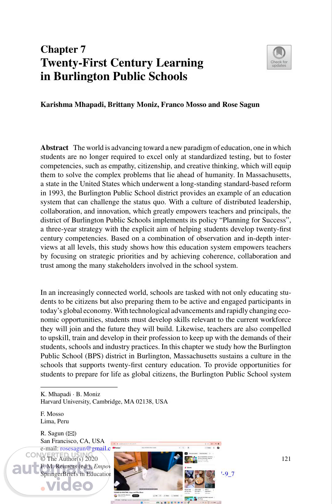 Chapter 7 Twenty-First Century Learning in Burlington Public Schools Karishma Mhapadi, Brittany Moniz, Franco Mosso and Rose Sagun Abstract The world is advancing toward a new paradigm of education, one in which students are no longer required to excel only at standardized testing, but to foster competencies, such as empathy, citizenship, and creative thinking, which will equip them to solve the complex problems that lie ahead of humanity. In Massachusetts, a state in the United States which underwent a long-standing standard-based reform in 1993, the Burlington Public School district provides an example of an education system that can challenge the status quo. With a culture of distributed leadership, collaboration, and innovation, which greatly empowers teachers and principals, the district of Burlington Public Schools implements its policy “Planning for Success”, a three-year strategy with the explicit aim of helping students develop twenty-first century competencies. Based on a combination of observation and in-depth inter- views at all levels, this study shows how this education system empowers teachers by focusing on strategic priorities and by achieving coherence, collaboration and trust among the many stakeholders involved in the school system. In an increasingly connected world, schools are tasked with not only educating stu- dents to be citizens but also preparing them to be active and engaged participants in today’s global economy. With technological advancements and rapidly changing eco- nomic opportunities, students must develop skills relevant to the current workforce they will join and the future they will build. Likewise, teachers are also compelled to upskill, train and develop in their profession to keep up with the demands of their students, schools and industry practices. In this chapter we study how the Burlington Public School (BPS) district in Burlington, Massachusetts sustains a culture in the schools that supports twenty-first century education. To provide opportunities for students to prepare for life as global citizens, the Burlington Public School system K. Mhapadi · B. Moniz Harvard University, Cambridge, MA 02138, USA F. Mosso Lima, Peru R. Sagun (B) San Francisco, CA, USA e-mail: rosesagun@gmail.com © The Author(s) 2020 F. M. Reimers (ed.), Empowering Teachers to Build a Better World, SpringerBriefs in Education, https://doi.org/10.1007/978-981-15-2137-9_7 121.