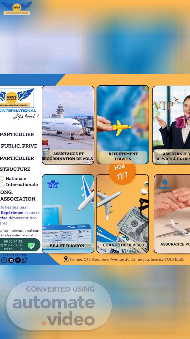 INTERNATIONAL PARTICULIER PUBLIC, PRIVÉ PARTICULIER STRUCTURE Nationale Internationale ONG, ASSOCIATION N'hésitez pas Expérience et notre tise depassent nos ires afas-internationalrorn :tOafas 96 32 34 32 7) 91 62 62 19 93 99 13 61 ASSISTANCE ET INATION DE VOLS 'ATA BILLET DAVIO g AFFRETEMENT DAVION CHANGÉDEbPVISES ASSISTANCE SERVICE LA DEB ASSURANCE VC Niamey. Cite Poudriére. Avenue du Damergou. face ex-TOUTELEC.